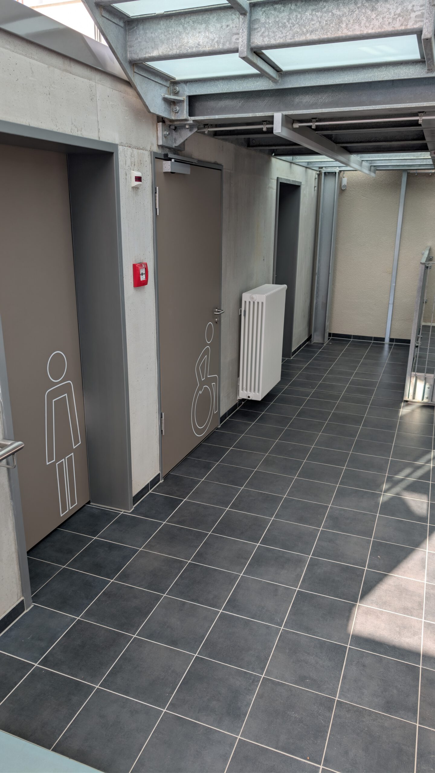 Auch Funktionsräume wie die sanitären Anlagen sind in das Leitsystem integriert. Zur Gewährleistung der Sicherheit auch unserer jüngeren Besucher sind auf den Glastüren Maßnahmen zum Durchlaufschutz integriert.