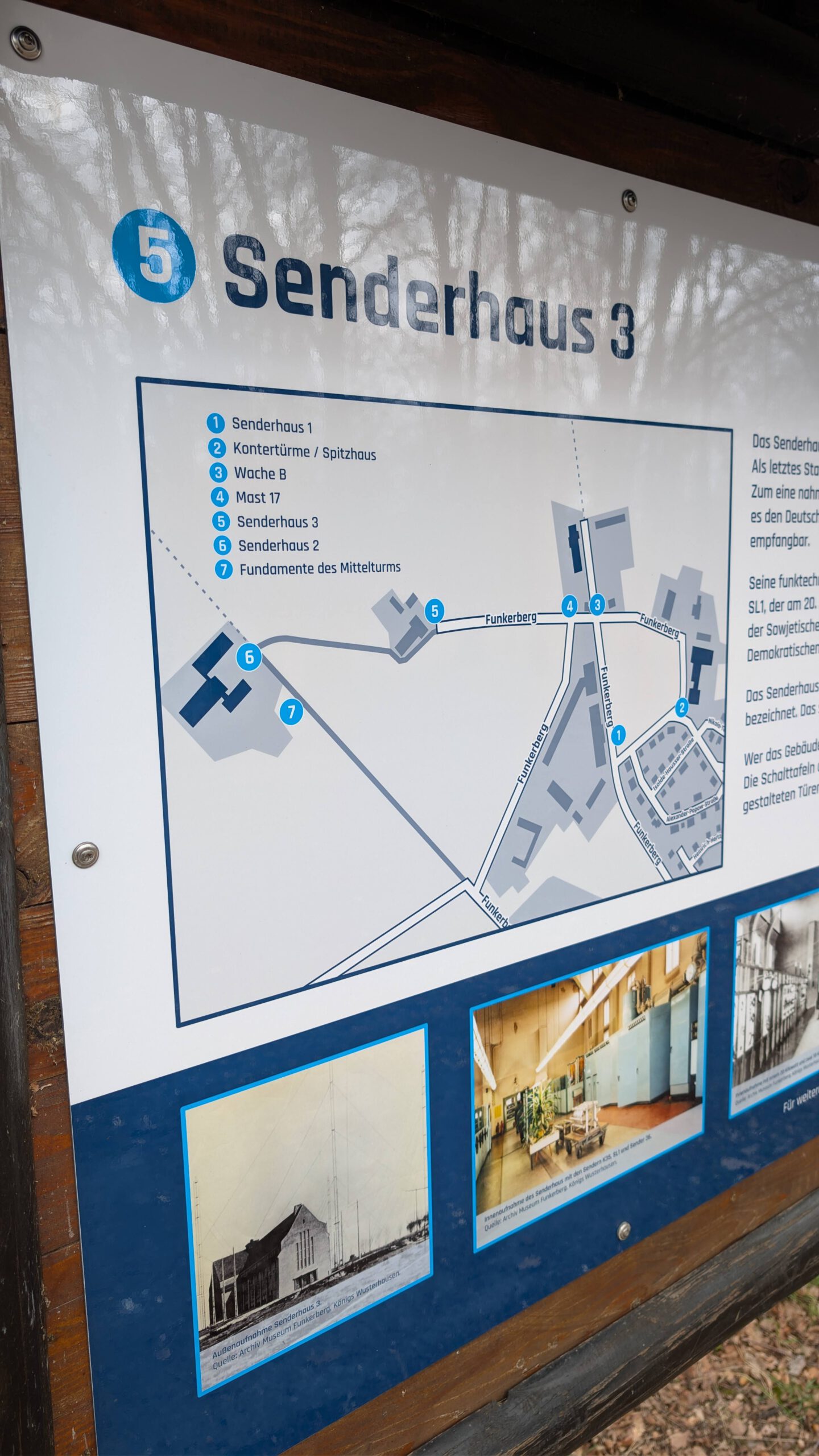 Das technische Denkmal Funkerberg umfasst ein weitläufiges Areal mit weiteren zahlreichen baulichen und funktechnischen Anlagen. Damit Besucher auch im Außenraum den Weg zum Museum finden und die Bedeutung der historischen Standorte verstehen, wird das Gelände durch acht neue Stellwände erschlossen.